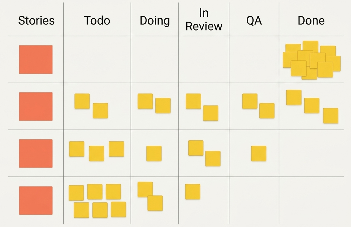 - Draw lanes on the whiteboard with a marker (Todo / In Progress / In Review / Done)